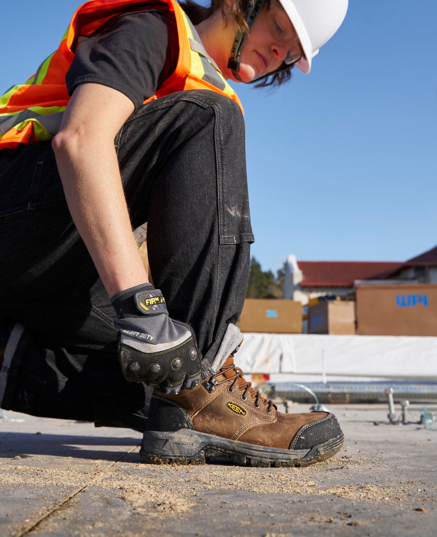 Protects like a work boot, feels like a sneaker. This women’s waterproof 6- style features a leather upper, energy-returning cushioning, and internal met protection.